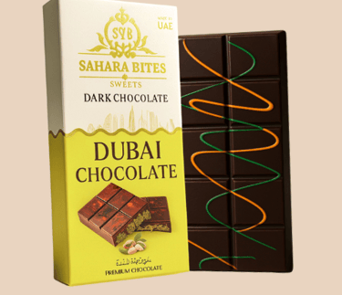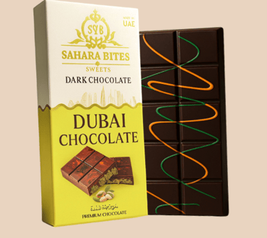 A smooth milk chocolate bar filled with creamy pistachio and crunchy kunafa, inspired by the luxury and elegance of Dubai.